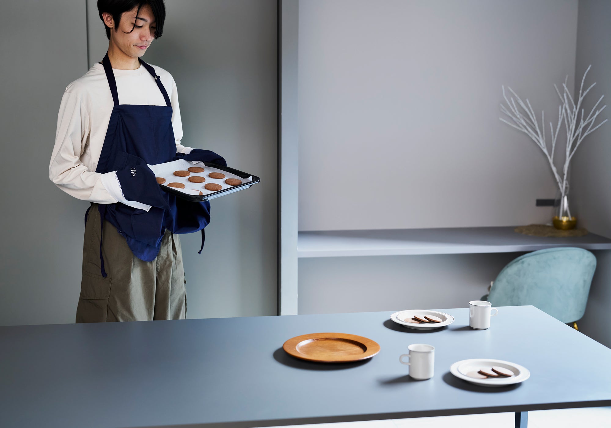 このエプロンには、加藤健旗店が長年手がけてきた暖簾や幕づくりの技術が活かされています。屋外や人の出入りが多い場所でも使われる暖簾に求められるのは、丈夫さと軽さの両立。『MAKU.』には、そうした用途に多く使われる「十番天竺」という生地が使われており、適度な厚みと強度、軽さをバランスよく備えています。さらに、染色も洗濯に耐える方法で行われているため、日常的に清潔に使え、時間とともに味わいが増す、経年変化も楽しめる仕様です。