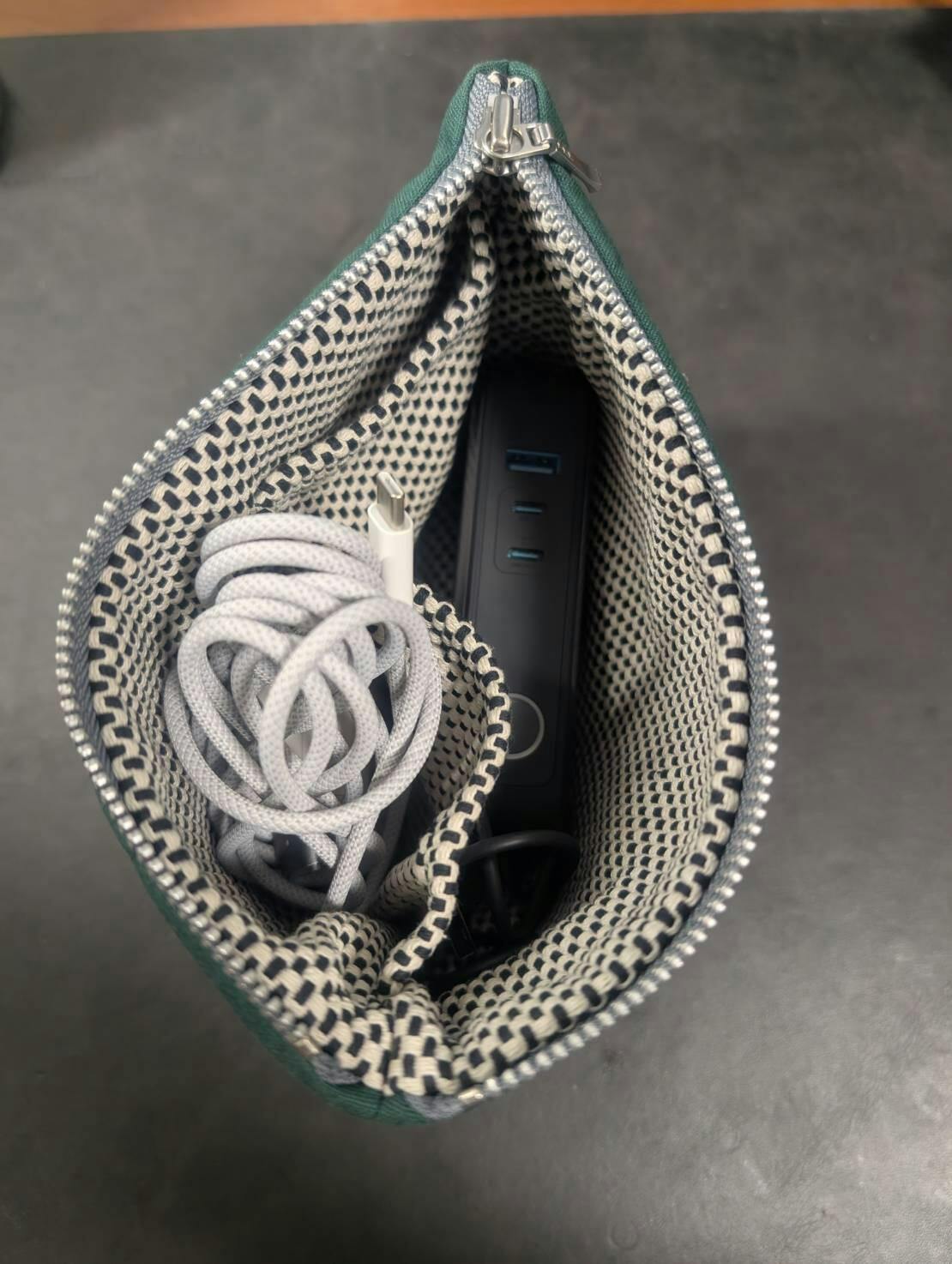 ポーチ本体にはマチが設けられており、PC周辺機器やマウス、ポケットWi-Fi、充電器といったアイテムも余裕をもって収納可能です。開口部はファスナー式で、内側には小物用ポケットを備え、USBメモリやSDカード、イヤホンなどの小さなアイテムもすっきり整理できます。